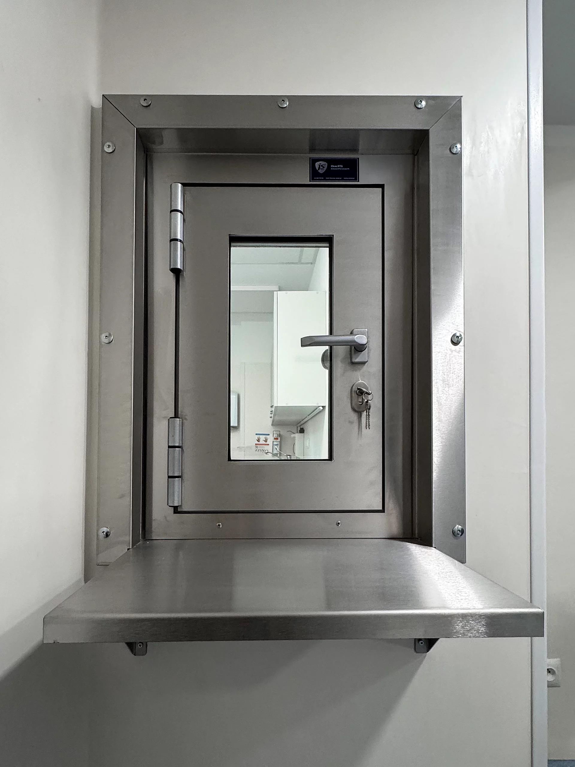Okno podawcze RTG umożliwia bezpieczne przekazywanie dokumentów, materiałów lub próbek pomiędzy pomieszczeniami objętymi osłoną radiologiczną.